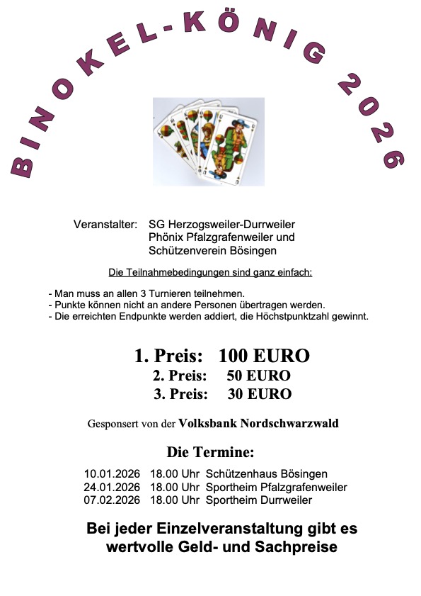 Am 7. Februar findet im Sportheim wieder einmal der Preis-Binokel statt. Gespielt wird ab 18 Uhr. Das Sportheim hat ab 17 Uhr geöffnet. Beim Finale von insgesamt drei Turniertagen warten für die ersten drei Tagessieger wieder Geldpreise und für die weiteren Teilnehmer attraktive Sachpreise. Das erste Turnier bestreitet der Schützenverein Bösingen am 10. Januar, das zweite Turnier veranstaltete der Phönix Pfakzgrafenweiler am 24. Januar.